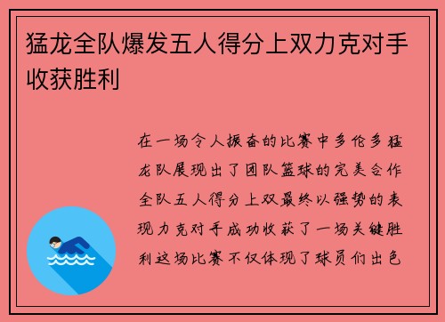 在一场令人振奋的比赛中,多伦多猛龙队展现出了团队篮球的完美合作,全队五人得分上双,最终以强势的表现力克对手,成功收获了一场关键胜利。这场比赛不仅体现了球员们出色的个人能力,更展现了团队之间的默契配合。猛龙队通过高效的进攻和严密的防守,充分发挥了全队的潜力,最终以均衡的得分和团队协作压制了对手,成功收获胜利。本文将从猛龙队五人得分上双的进攻火力、团队防守的稳定性、关键时刻的表现以及球员个人发挥等四个方面进行详细阐述,力求全面分析这场胜利的关键因素。